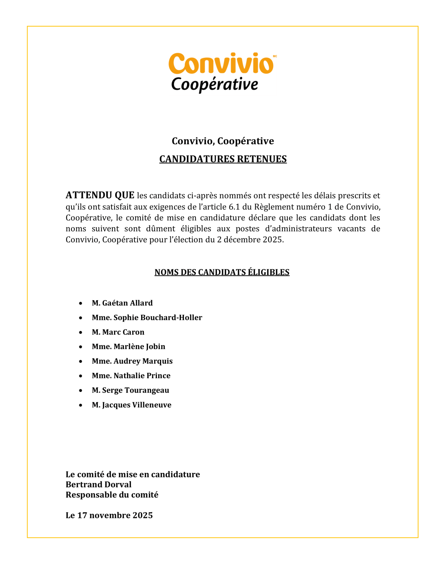 Convivio veut offrir le meilleur d’un supermarché coopératif en répondant à l’appétit de découverte de ses membres par l’engagement, l’esprit d’équipe, le service et l’innovation. Il faut dire que les défis ont été nombreux et complexes, depuis mon élection. On a pu observer, au cours des dernières années, une transformation marquée du secteur de l’alimentation. Fort heureusement, Convivio a le privilège de pouvoir compter sur une équipe exceptionnelle de plus de 600 passionnés, axée sur la satisfaction de ses membres ainsi qu’en veille constante quant aux tendances du marché.