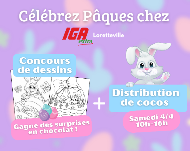 Samedi 4 avril, vos IGA extra Loretteville, IGA extra Val-Bélair et IGA Saint-Jean-Chrysostome célèbrent Pâques avec des activités en magasin ! Venez faire un tour !