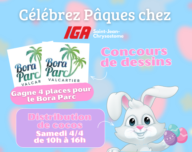 Participez au concours de dessins en magasin et courez la chance de remporter 4 places pour le Bora Parc, Valcartier et venez nombreux pour la distribution de cocos du lapin de Pâques de 10h à 16h.