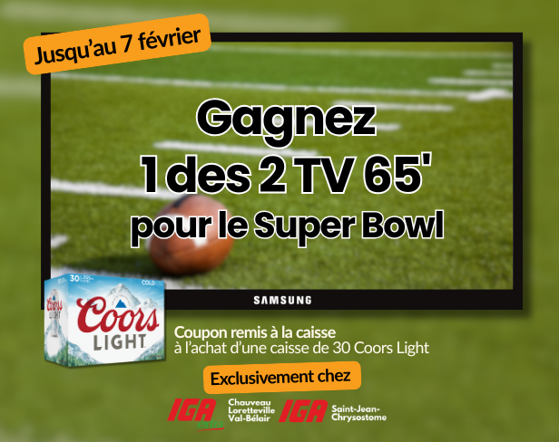 Jusqu’au 7 février, participez à notre concours en magasin et gagnez l’une des deux téléviseurs de 65 pouces mis en jeu. Une belle occasion de s’équiper pour le grand match… ou pour toutes les soirées qui suivront.
