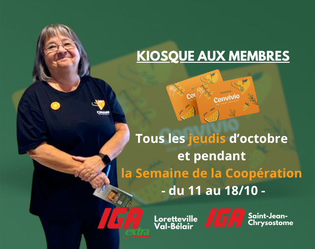 C'est le Mois de la Coopération dans votre IGA St-Jean-Chrysostome ! Profitez en magasin de nos nombreux Spéciaux Convivio ! Participez à notre grand concours "Paniers...