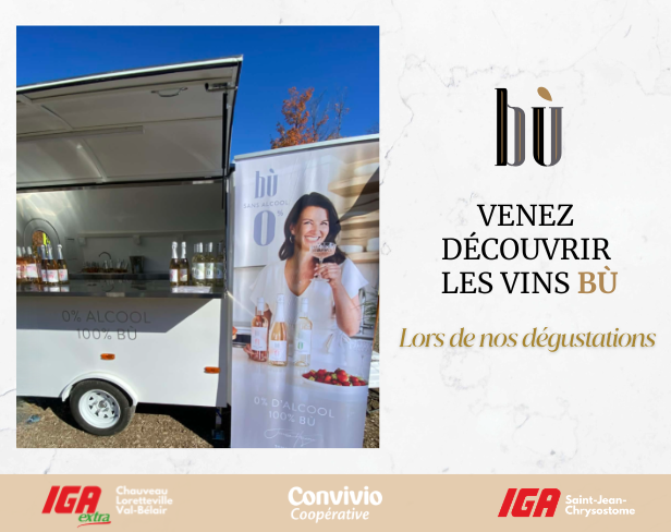 Vos IGA extra et IGA Convivio vous invitent à découvrir des produits Arterra en dégustation ! Venez goûter aux célèbres vins Bù sans alcool de la sommelière Jessica Harnois, ainsi qu’aux délicieux Laloux Limoncello et Laloux Yuzu Tropical.
