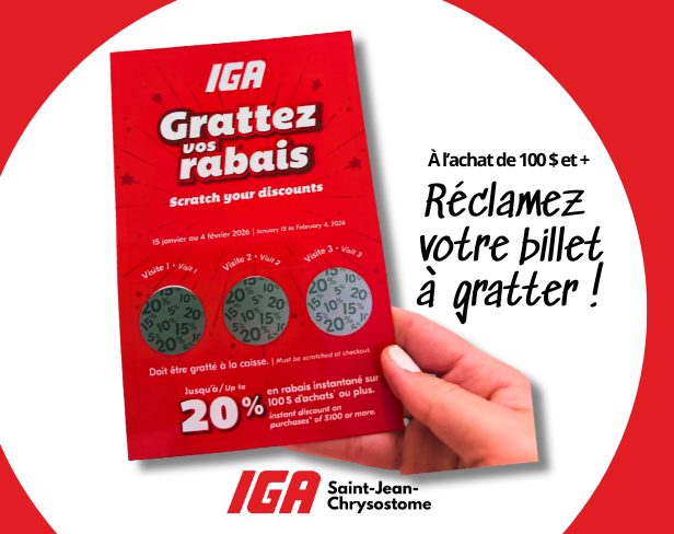 Du 15 janvier au 4 février, à votre IGA Convivio de St-Jean-Chrysostome, recevez un billet à gratter à la caisse à l’achat de 100 $ et plus.