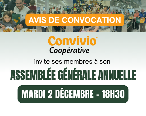 Lire l'articleL'assemblée générale annuelle de Convivio, Coopérative aura lieu le mardi 2 décembre 2025, à 18h30. ...