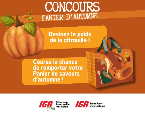 Du 2 au 25 octobre, rendez-vous dans l'un de vos IGA extra Convivio, devinez le poids de notre citrouille géante et courez la chance de remporter votre Panier de saveurs d'automne d'une valeur de 100$ contenant :