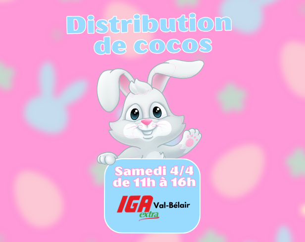 De 11h à 16h, passez au magasin de Val-Bélair ! Le lapin de Pâques vous attend pour une chasses aux oeufs. Vous ne voulez pas manquer ça !