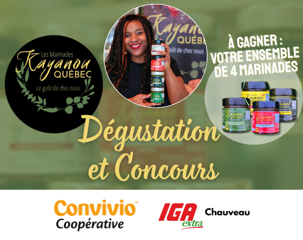 Le 18 octobre prochain entre 12h et 17h, venez découvrir les savoureuses marinades Kayanou lors de notre dégustation en magasin au IGA extra de Chauveau et courez la chance de repartir avec un ensemble de 4 marinades d’une valeur de 40$ !